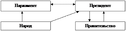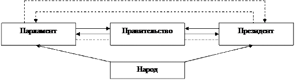 При наличии многопартийной системы разногласия между фракциями в парламенте затрудняет работу правительства, которое вынуждено обращаться за поддержкой к президенту. Исследователи насчитывают не менее 20 государств со смешанной формой правления (Франция, Российская Федерация и др.). Взаимодействие в системе публичной власти в Президентско-парламентской республике показано на рисунке 3.