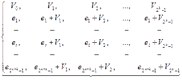 Vi=ki1V1+ki2V2+…+ kikVk, где Vj, j=1 … k,-кодовые комбинации (n,k)-кода, являющиеся строками канонической формы порождающей матрицы этого кода, ki,j - элементы кодируемой k - элементной последовательности.