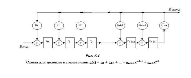 показана на рис.6.4. Схема представляет собою регистр сдвига с обратными связями. Обратные связи соответствуют виду многочлена g(x). В исходном состоянии ячейки регистра содержат нули. Делимый многочлен