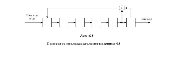 Для примера на рис.6.8 приведена структурная схема генератора последовательности максимальной длины, построенной на основе
