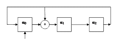 Построим генератор элементов поля GF(23). Для этой цели используем примитивный многочлен 1+x+x3. Класс вычетов {x}= α является корнем 1+x+x3 и примитивным элементом поля GF(23). Схема генератора элементов поля GF(23) представлена на рис. 6.9. Предварительно в ячейку α0 записывается «1». После этого осуществляются сдвиги. Выходом генератора является содержимое ячеек α0,α1,α2.