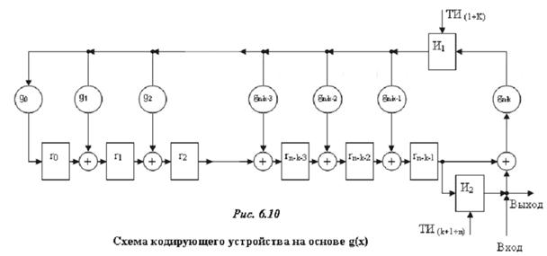 . Данная схема строится на основе схемы, представленной на рис. 6.6 и в общем случае имеет вид, изображенный на рис. 6.10. Число ячеек памяти в регистре равно n-k, т.е. числу избыточных элементов в кодовой комбинации. Обратные связи подключены в соответствии с ненулевыми коэффициентами g(x), следовательно, общее число обратных связей равно числу компонентов g(x) (или весу в двоичном представлении). Число сумматоров по модулю 2 равно числу знаков “+” в записи g(x) в виде многочлена.