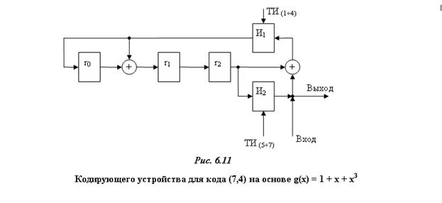 В основе кодирующего устройства лежит схема деления на порождающий многочлен g(x) степени n-k с предварительным умножением на