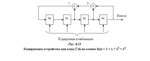 Кодирующее устройство для циклического (n,k) – кода может быть построено на основе схемы для решения рекуррентных соотношений (рис. 6.7). Структурная схема кодирующего устройства для этого случая представлена на рис. 6.12. В основе схемы лежит регистр сдвига из k ячеек, обратные связи построены в соответствии с видом h(x) и их число определяется числом ненулевых компонент в h(x) (или весом h(x) в двоичном представлении), число сумматоров по модулю 2 на 1 меньше число знаков “+” в записи h(x) в виде многочлена.