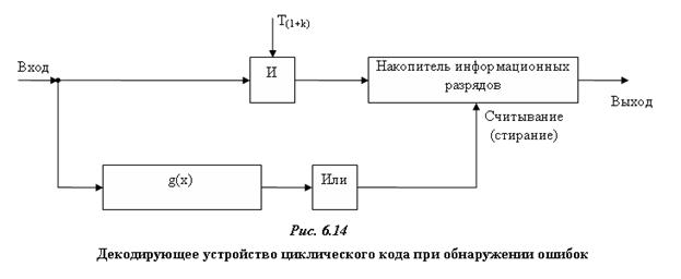 Рассмотрим способ построения декодирующих устройств для циклических кодов в режиме обнаружения ошибок. Декодирующее устройство, использующее свойство делимости любой комбинации циклического кода на его порождающий многочлен g(x), показано на рис. 6.14.