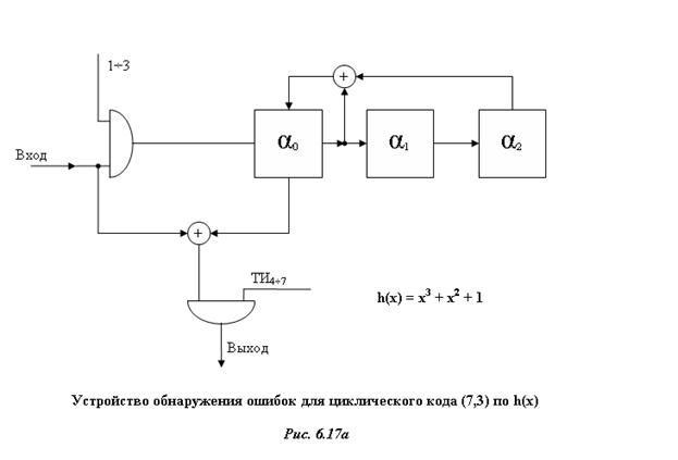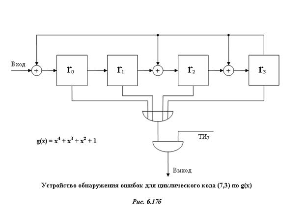 На рис. 6.17 для сравнения приведены устройства обнаружения ошибок для циклического кода (7,3), построенные по h(x) (Рис 6.17а) и по g(x)(Рис 6.17б)
