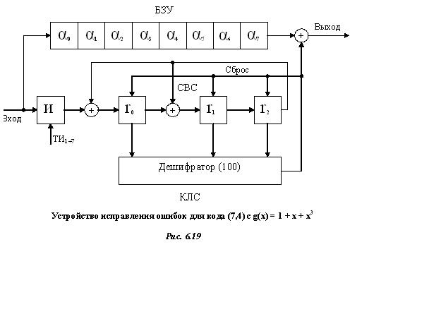 . Этот код имеет dmin = 3, т.е. исправляет все одиночные ошибки. Общий вид схемы исправления одиночных ошибок для данного кода представлен на рис. 6.19.