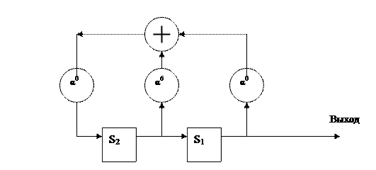 В исходном состоянии в ячейках памяти регистра записаны компоненты синдрома S1=α3 и S2=α5. По второму такту S2=α5 поступает на выход, а в ячейках остаются S3=α6 и S4=0, которые за два следующих такта поступают на выход.