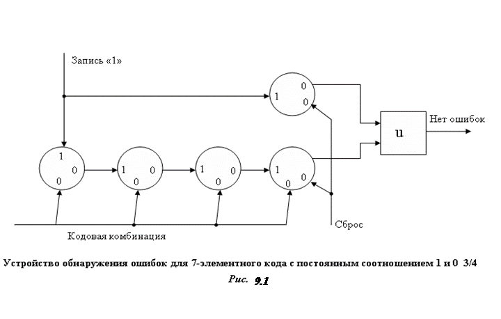 . Минимальное расстояние в таком коде равно dmin =2. Однако при применении в качестве устройства обнаружения ошибок схемы “взвешивания” принятой кодовой комбинации (рис. 9.1) обнаруживаются все ошибки, за исключением ошибок транспозиции элементов.