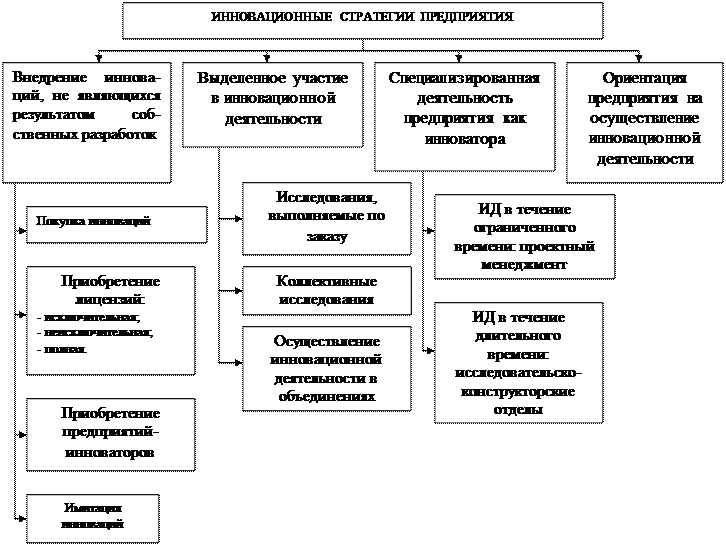 Практика подтверждает тщетность попыток создать единую, универсальную инновационную стратегию. Известно много вариантов стратегий, каждая из которых может быть эффективной. Их можно распределить по степени самостоятельности и полноты проведения инновационного процесса на следующие четыре группы: внедрение новых изделий и технологий, не являющихся результатом собственных разработок; выделенное участие в инновационной деятельности; специализированная деятельность предприятия как инноватора; ориентация предприятия на осуществление инновационной деятельности.