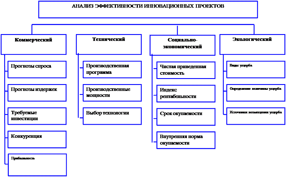 Оценка эффективности инновационных проектов осуществляется по нескольким направлениям: к ним относятся коммерческий анализ, экономический анализ, социальный, экологический, правовой, бюджетный, финансовый, технический анализ и т.д. (РМ1).