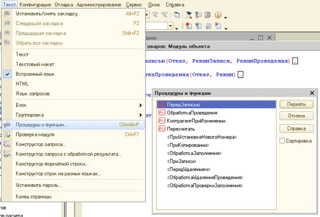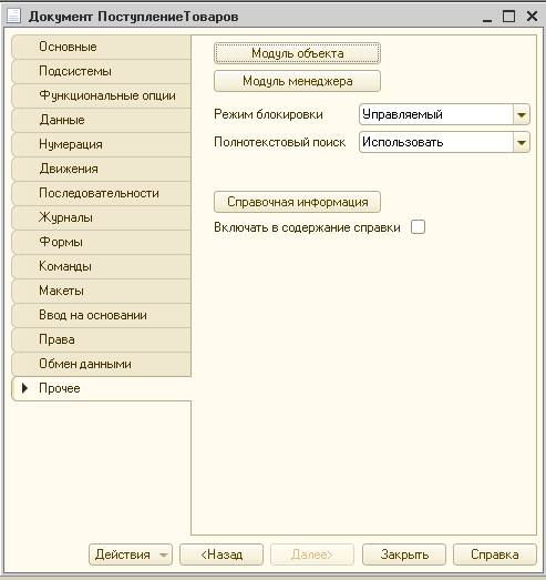 Для открытия модуля объекта можно использовать либо одноименную команду контекстного меню объекта конфигурации, либо кнопку, расположенную на закладке «Прочее» формы объекта конфигурации.