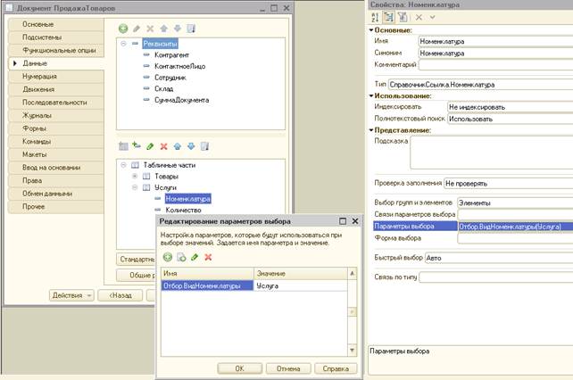 Измените необходимые обработчики событий. Для реквизита «Номенклатура» табличной части «Услуги» настройте свойство «Параметры выбора».
