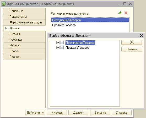 Создайте журнал «СкладскиеДокументы». В нем должны регистрироваться документы «Поступление товаров» и «Продажа товаров»: