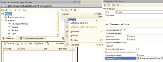 Создадим форму списка регистра, она не будет основной формой. В свойствах основного реквизита формы изменим основную таблицу (на «РегистрСведений.КурсыВалют.СрезПоследних»).