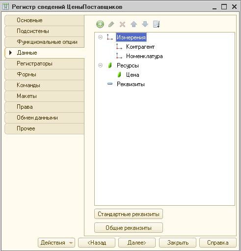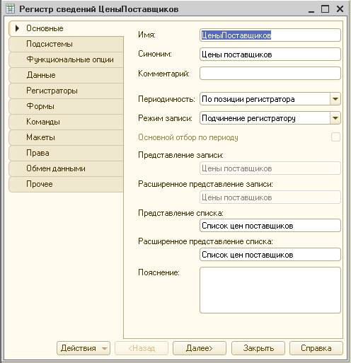 Создадим регистр сведений «ЦеныПоставщиков» (как на рисунке):