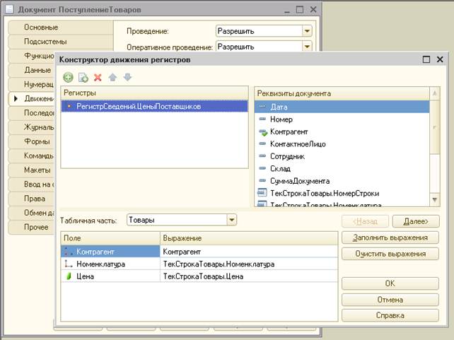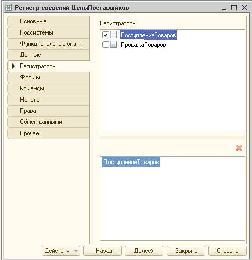 Документ имеет режим записи «Подчинение регистратору», в соответствии с этим стала доступной закладке «Регистраторы». В качестве регистратора нужно отметить документ «Поступление товаров».