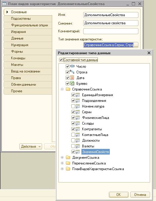 Следует отметить, что подобный механизм можно реализовать и через справочник, но в том случае если нужно контролировать типы свойств, наиболее просто его реализовать через план видов характеристик (в записи плана видов характеристик будет находиться, не только «наименование» свойства, но и его тип). Используя возможность хранения «типа свойства» можно реализовывать всевозможные механизмы контроля. Например, если указан для свойства «Фасовка» (элемент плана видов характеристик) тип «СправочникСсылка.ЕдиницыИзмерения», то в качестве значений для данного свойства можно выбрать только ссылку на элемент справочника «ЕдиницыИзмерения».