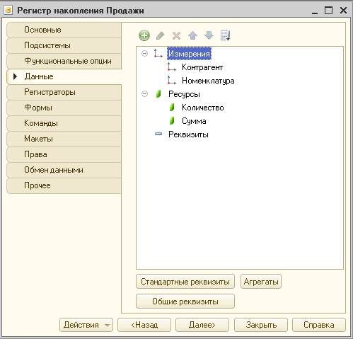 Создайте регистр накопления «Продажи». Вид регистра «Обороты». Состав измерений и ресурсов приведен на рисунке: