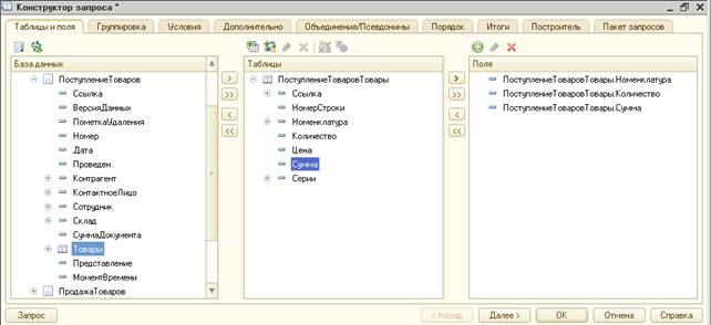 С первыми тремя закладками конструктора вы уже знакомы. В качестве источника данных выберем табличную часть «Товары» документа «ПоступлениеТоваров»: