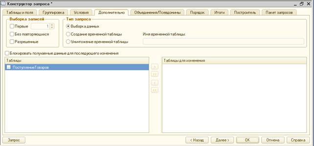 На закладке «Дополнительно» можно отметить ряд флагов (касающихся ключевого слова «Выбрать» языка запросов) и определить состав таблиц предназначенных для изменения.