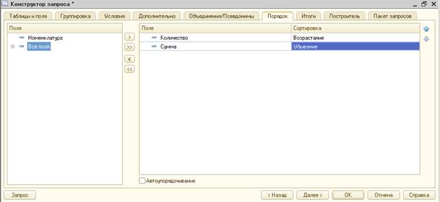 На закладке «Порядок» можно определить порядок сортировки записей в результате запроса.