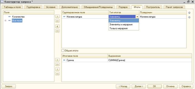 При определении раздела «Итоги» следует быть готовым к тому, что в результате запроса появятся «дополнительные» итоговые записи. Вместе с этими записями результат запроса становится иерархическим.