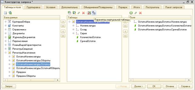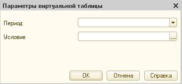 Состав параметров напрямую зависит от выбранной виртуальной таблицы. При определении условия можно повторно (вложено) вызывать конструктор запроса для определения подзапроса.