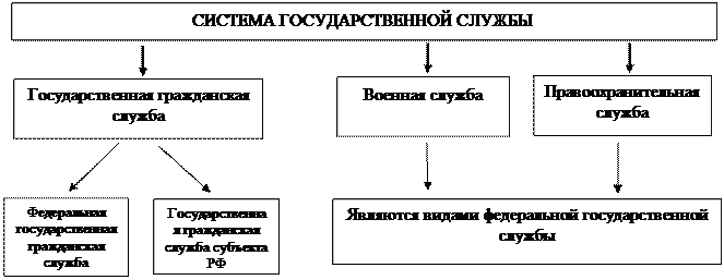 В соответствии со ст. 2 ФЗ № 58 «О системе государственной службы РФ» к видам госслужбы отнесены: 1) государственная гражданская служба; 2) военная служба; 3) правоохранительная служба. При этом если государственная гражданская служба подразделяется на два уровня: федеральную государственную службу и государственную гражданскую службу субъекта РФ, то военная и правоохранительная службы являются видами лишь федеральной государственной службы.