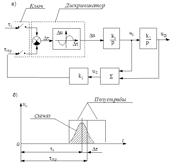 Для непрерывного сопровождения отраженного сигнала по дистанции в РК используется следящий дальномер (рис. 2.7,а), который представляет собой дискретную нелинейную астатическую следящую систему. Дискретность системы связана с дискретностью зондирующего сигнала, и такт замыкания ключа соответствует тактовой частоте РК, кроме специальных случаев или режимов, когда отраженный сигнал периодически (с частотой замирания) отсутствует.