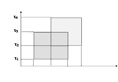 7. Задача.. Определить решающее правило и оценить вероятность селекции цели на фоне одной помехи по двум признакам - несущей частоте f и длительности зондирующего сигнала t, при известных равномерных законах распределения этих признаков (рис. 3.11) для цели - w1 (f, t ) и помехи - w2 (f, t ).