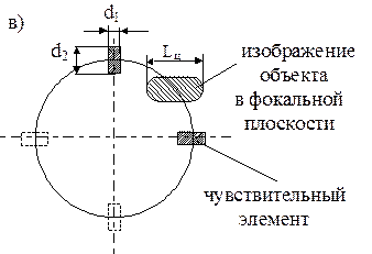 Для определения рассогласования линии визирования цели и оптической оси приемной системы возможны различные траектории смещения фокуса в фокальной плоскости и расположение светочувствительных площадок светоприемного устройства. На рис. 4.16,а показана траектория смещения фокуса в виде окружности радиуса r, создаваемая вращением модулирующего зеркала-контротражателя вокруг оптической оси, наклоненного к этой оси на угол q = r / (2F). Траектория проходит через центр двухплощадочного светочувствительного элемента, чем обеспечивет линейность пеленгационной характеристики в одной плоскости и релейность в другой. Координатор с вибрирующим в двух плоскостях зеркалом и одноплощадочным чувствительным элементом (рис. 4.16,б) имеет линейную пеленгационную характеристику в вертикальной и горизонтальной плоскостях. Чувствительный элемент с перпендикулярно расположенными светочувствительными площадками (рис. 4.16,в) и наклонным модулирующим зеркалом создает линейную пеленгационную характеристику в двух взаимно перпендикулярных плоскостях.
