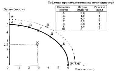 Возможный выпуск продукции характеризует кривая производственных возможностей. Поясним это на условном примере. Допустим, что в обществе производятся лишь два блага: зерно и ракеты. Если общество использует свои ресурсы для производства только зерна, то оно производит его 5 млн. т; если же только для производства ракет, то их производится 6 штук. При одновременном производстве обоих благ возможны следующие сочетания (см. рис. 1.1).