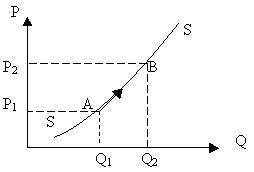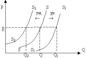 Например, повышение цен на факторы производства означает сокращение предложения (при цене Р объем предложения сокращается до Q2), кривая сдвигается из положения SS в положение S2S2. И, наоборот, в случае понижения цен на факторы производства произойдет увеличение предложения, кривая сдвинется в положение S1S1.