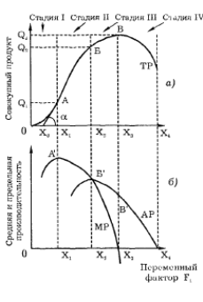 Если на первой стадии (ОА) совокупный продукт возрастает медленнее, чем использованное количество переменного фактора, то на второй стадии (АБ) совокупный продукт растет быстрее, чем использованное количество переменного фактора.