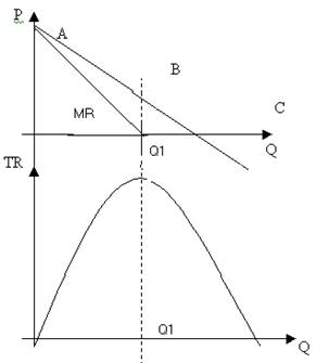 Из графика на рисунке видно, что до объема выпуска Q1 совокупный доход растет и после этого падает. Кривая предельного дохода выше горизонтальной оси, когда совокупный доход растет, и ниже, когда совокупный доход падает.