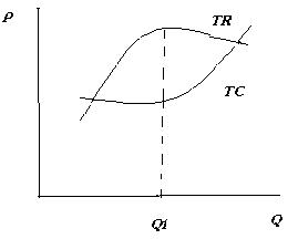 С точки зрения подхода «совокупный доход-совокупные издержки» прибыль фирмы максимальна, когда максимальна разница между совокупным доходом и совокупными издержками (при объеме Q1), что отражает график на рисунке 8.10.