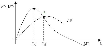 Анализ графика показывает, что до тех пор, пока MP>AP, кривая MP располагается выше кривой AP и величина AP возрастает. Если же MP<AP и кривая MP проходит ниже кривой AP, то величина AP убывает. В т. a MP=AP и величина AP при этом имеет максимальное значение. Следовательно, вводить дополнительные ресурсы труда сверх величины L2 не целесообразно, т.к. средний продукт будет сокращаться.