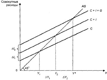 Увеличение или уменьшение инвестиций ведет к росту или падению объектов производства, занятости и доходов. Эти закономерности наблюдаются не только применительно к инвестициям, но и в связи с любыми другими видами расходов, в том числе пока не рассмотренными нами государственными расходами и чистым экспортом.
