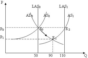 Уровень потенциального объема производства увеличился с 50 до 110 единиц, кривая совокупного предложения в долгосрочном периоде сместилась из LAS0 в положение LAS1. Совокупный спрос (AD0) при этом не изменился в силу проведения, например, жесткой денежно-кредитной, политики. В этом случае произойдет незапланированное увеличение товарно-материальных запасов у производителей, и они не смогут реализовать увеличившийся объем производства. А чтобы избежать накопления нереализованных запасов, им придется снизить цены, надеясь, на увеличение сбыта. Одновременно с этим они сократят объемы производства, перемещаясь из точки E2 в E1 вдоль краткосрочной кривой совокупного предложения AS1. Потребители увеличат объем покупок с 50 единиц до 90, т.е. переместятся из точки E0 в точку E1 вдоль кривой совокупного спроса. В итоге установится равновесие при неполной занятости, уровень безработицы возрастет, и экономика не сможет реализовать имеющийся потенциал экономического роста.