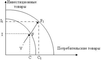 Рост происходит, когда используемые ресурсы направляются в производство и экономика перемещается из внутренней точки в точку производственных возможностей(V–F). Экономический рост происходит в том случае, когда кривая смещается вправо (F–F1), т.е. происходит расширение производственных возможностей экономики страны (потенциального ВВП), а это свидетельствует о наличии интенсивного экономического роста. В результате одновременно увеличивается количество интенсивных товаров (I–I1) и потребительских (С–С1) при любых альтернативных инвестиционных издержках.
