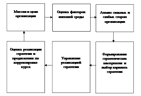 Процесс стратегического управления представляет собой последовательные этапы формирования и реализации стратегического плана организации. Поэтому нередко для обозначения процесса управления используются термины «планирование стратегии» или «стратегическое планирование».