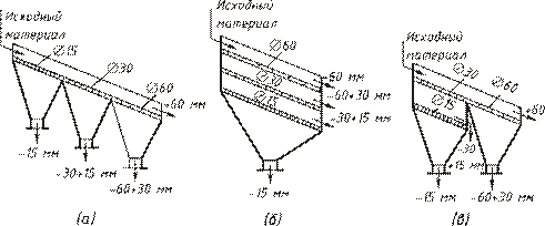 Существуют три (рис. 3.11) основные схемы рассева: 1) от мелкого к крупному через последовательный ряд сит с увеличивающимися размерами отверстий; 2) от крупного к мелкому через расположенные друг над другом сита с уменьшающимися размерами отверстий;
