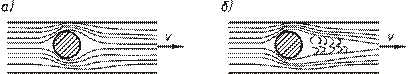 С развитием турбулентности все большую роль начинают играть силы инерции. Под действием их пограничный слой отрывается от поверхности, что приводит к образованию за телом отрывного (вихревого) течения, направленного навстречу потоку (см. рис.). В результате возникает дополнительная сила сопротивления, направленная навстречу потоку. Вследствие этого давление в лобовой части тела всегда оказывается больше давления в его кормовой части. Равнодействующая этих сил давления, отличная от нуля, и определяет собой сопротивление давления. Поскольку она зависит от формы тела, ее называют сопротивлением формы.
