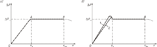 (а) – кривая идеального псевдоожижения; (б) – реальные кривые псевдоожижения