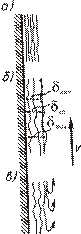 При критической скорости газа поток может вызвать срыв плёнки жидкости со стенки или обратное (инверсное) течение плёнки (рис. 4.6, в).