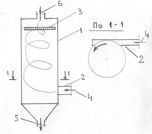 | 1 – корпус; 2 – патрубок; 3 – сопло; 4 – запыленный газ; 5 – осадок; 6 – очищенный газ Рисунок 4.6, а– Принципиальная схема центробежного скруббера |