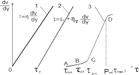 1 – ньютоновская жидкость; 2 – бингамовская неструктурированная жидкость;