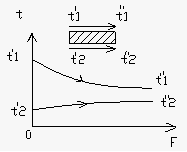 На рисунке показан характер изменения температур теплоносителей при различной организации движения их вдоль поверхности теплообмена F. Здесь