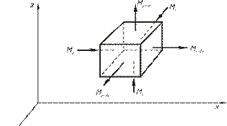 Выделим в установившемся потоке элементарный параллелепипед (рис. 6.4) с рёбрами dx, dy, dz. Не останавливаясь подробно на рассуждениях (они аналогичны выводу дифференциальных уравнений движения Навье-Стокса), можно сказать, что за время dt вследствие перемещения вещества только за счёт конвективного переноса содержание распределяемого вещества в объёме параллелепипеда изменится на величину.